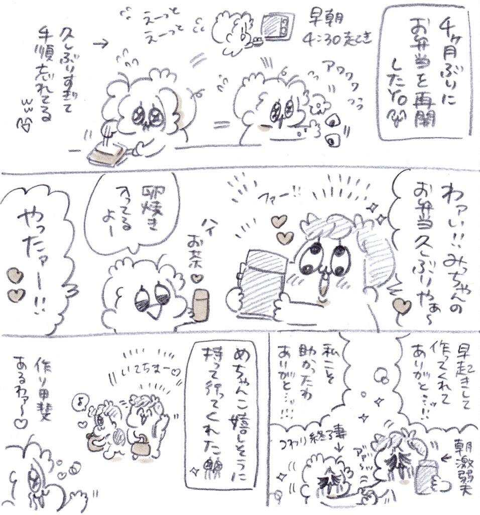 マジでしんどい時はそんなこと思う余裕もないし、気づいても「ほんまごめん😣」と言って頼んでるので、思い遣って行動できるっていうのが少し余裕が生まれた証拠なのだろうと思いました😊元気になってきたので早朝起きもそんなに苦じゃないし、お弁当を作ると夫が嬉しそうに持って行ってくれるので作り甲斐がありますね😊