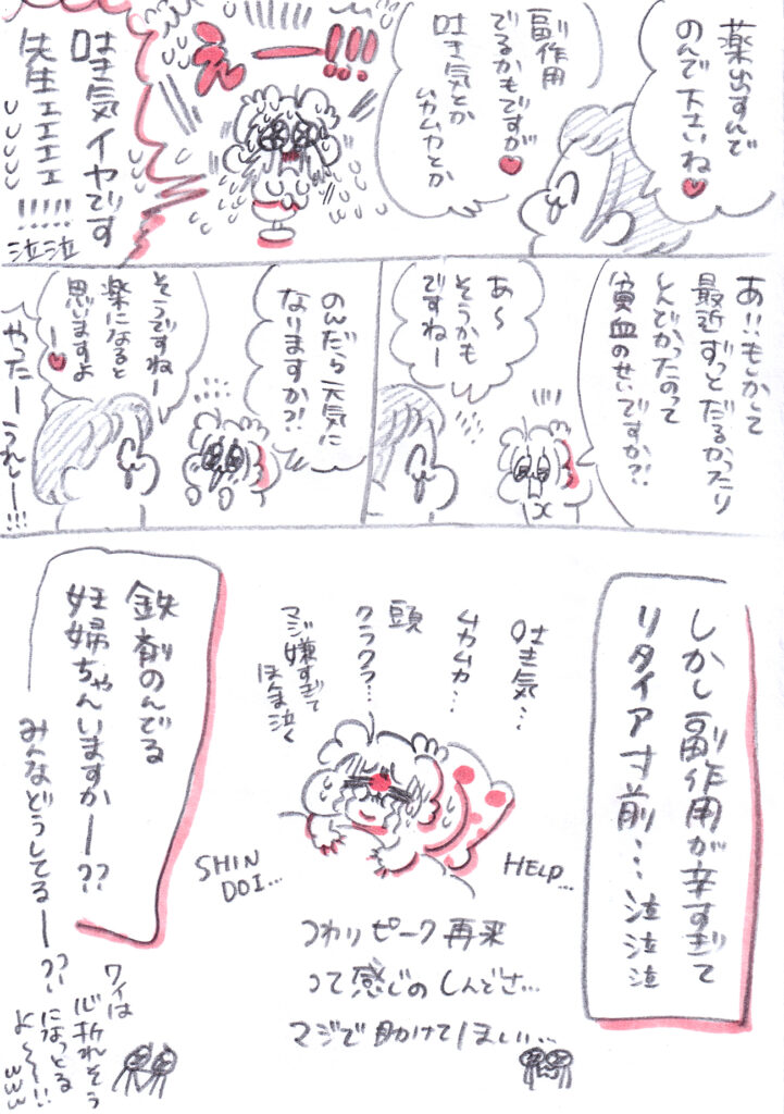 薬剤師さんに聞いたら、比較的優しい鉄剤を処方してもらっているそうで、昔はもっと副作用が強かったけど今は改良されて飲みやすくなったそうです。そう聞いたので頼むから軽くあってくれェ〜〜〜と思ってましたが、つわりの時のようなムカムカや気持ち悪さ、あと頭がクラクラして動くと酔う感じがあってフツーにしんどいです🥲